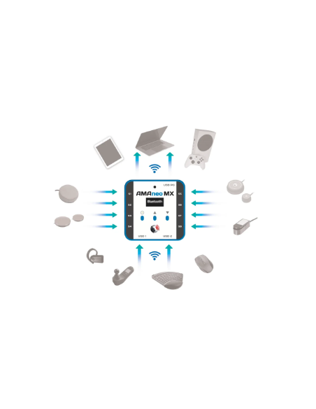AMAneo MX combine plusieurs solutions en un seul appareil. Il vous suffit de sélectionner un profil via l’écran et vous êtes prêt à l’utiliser. Qu’il s’agisse d’un filtre de tremblement pour la souris, de transformer une souris Bluetooth® en joystick pour le jeu, ou d’un boîtier de commutation pour contacteurs sur tablette ou ordinateur portable, AMAneo MX a la solution qu’il vous faut. Vous pouvez également créer facilement vos propres profils pour des solutions personnalisées.